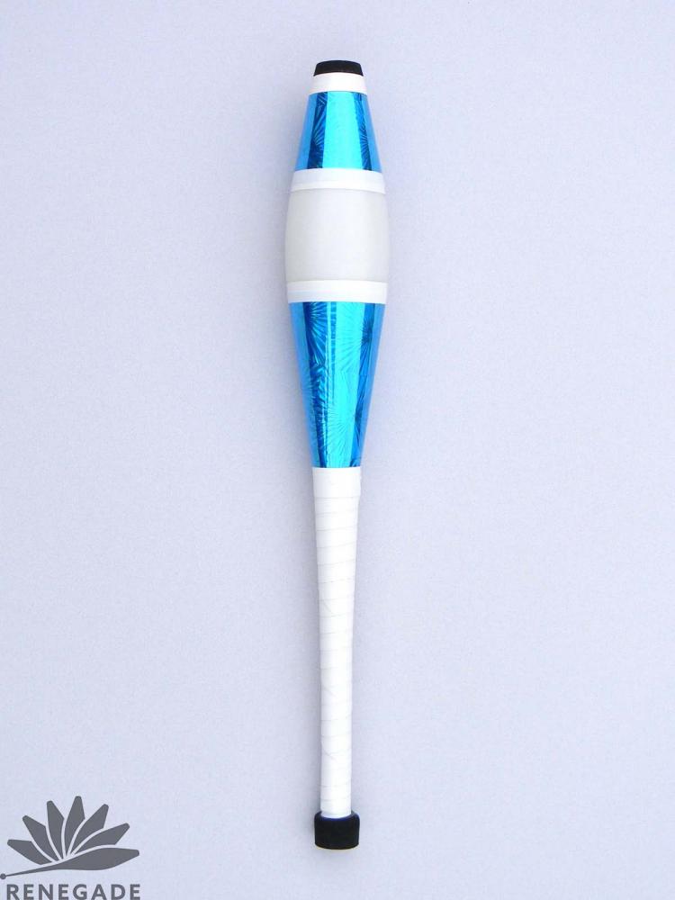 All Renegade clubs are custom made to order. 75mm decorated juggling club design features: choice of decoration, choice of body and trim tape color, taped or untaped white handle, black or white rubber, standard or shorter length handle.