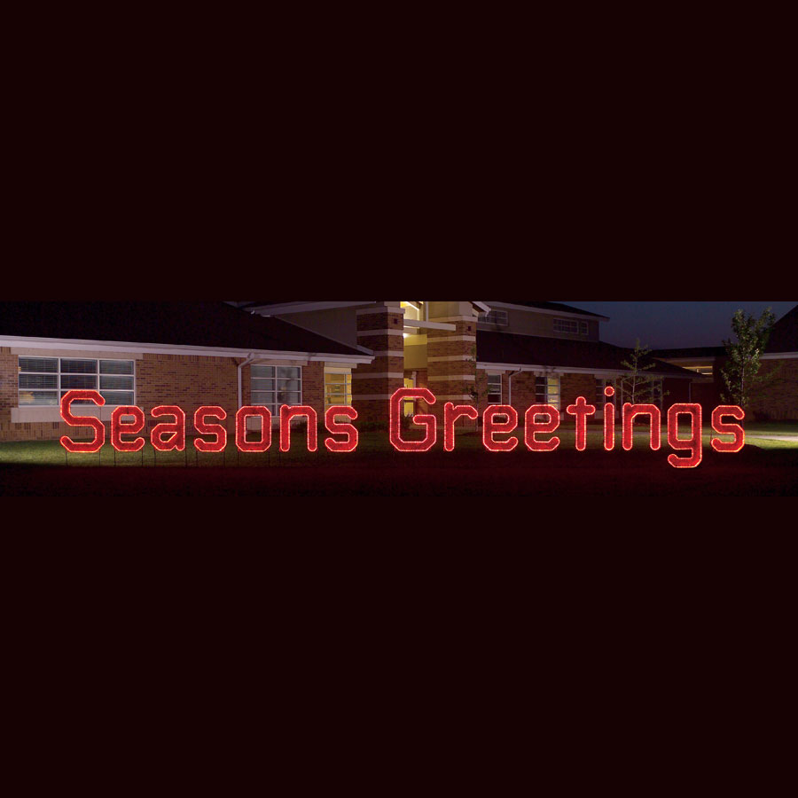 Send a special seasonal sentiment from afar with this enormous "Season's Greetings" sign by Holiday Lighting Specialists. Measuring 44 feet wide and adorned with 2,890 commercial-grade LED rope lights as well as fade-resistant fine-cut garland, this king-sized holiday sign looks attractive day and night. Ground mounting is simple with the included ground stakes and guy wires, while the sign's unique integrated wiring harness allows the entire display to be powered with a single extension cord.