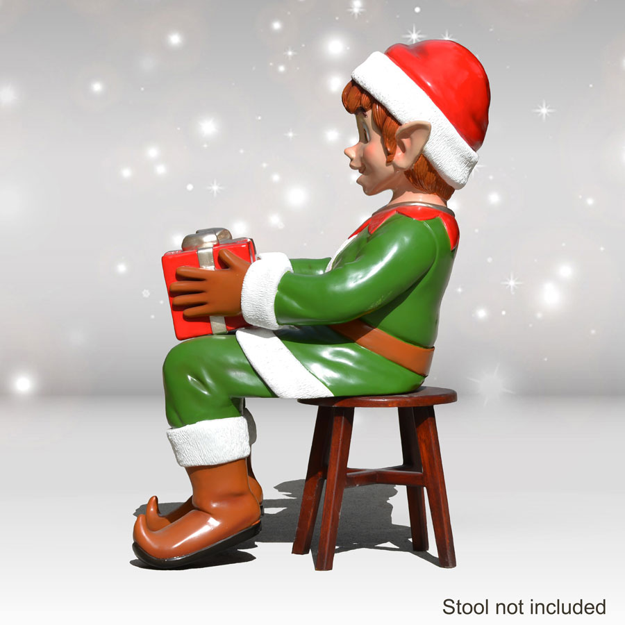 This 36-inch high Sitting Santa's Elf decoration by Heinimex is made to sit on the back seat of the Giant Four-Seater Sleigh (See item 37710 below). The elf is depicted carrying a present and features rich color, expressive facial detail and intricate, painted accents. It is crafted from durable, chip-resistant fiberglass that allows it to stand up to the elements when placed outdoors. It is part of the Heinimex Christmas Collection.