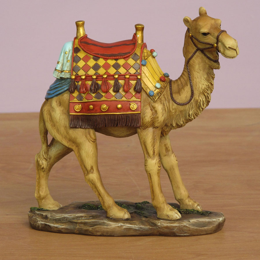 Bring your indoor nativity scene to life with these intricately hand-painted nativity animals made by Three Kings. The set includes four realistic animals made from polymer resin, including a standing camel, a sitting camel, a donkey and an ox. The nativity camels are intricately painted with authentic saddles for a colorful Old World touch. They are also sold as part of the Three Kings Real Life Nativity Collection from Christmas Night Inc.