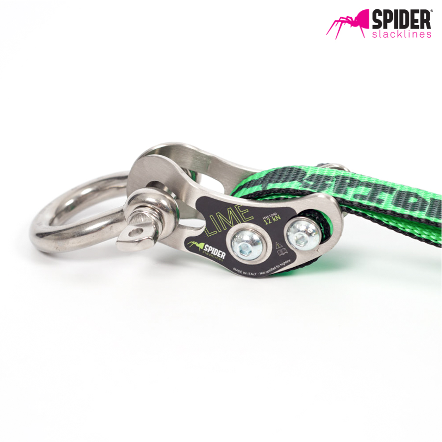 Line Lock for 25mm long lines Designed and produced entirely in Italy by Spider Slackline. Lime line lock is developed to be versatile with any type of connector, light and resistant with a working load up to 12kN. A line lock is essential for tensioning slacklines longer than 50 meters. LIME has a central cylinder in GREEN high load anodized aluminum. The 3mm high load 310 steel plates and pin allow a high working load, also thanks to the “quick lock pin" you can anchor the webbing so fast and easy. The rear hole of 16mm width makes it compatible with all main connectors.