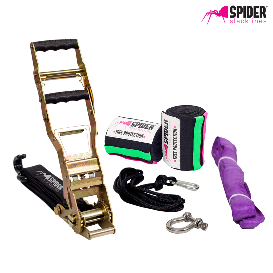 The Mandingo Ratchet ( for 50cm webbing) and Hummer Ratchet (for 40cm webbing) are the top of line ratchets made for slack liners who like to make there own custom rigs. Both ratchets have a excellent weight to torque ratio. They both can be used with a 2.5cm sling for anchoring. Note: the Hummer ratchet is now in black color like the White Line Ratchet, center in photo.