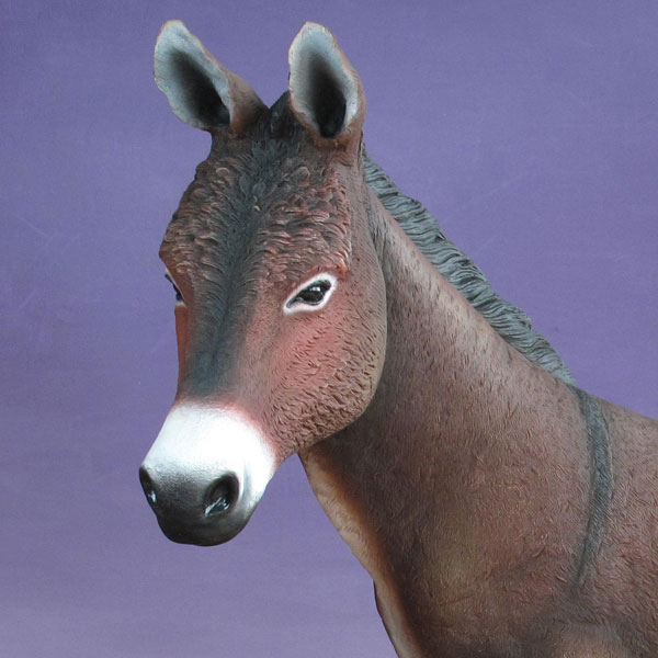 The large donkey figure is hand painted and measures 49 inches tall. It is made of fiberglass, allowing it to be incredibly lightweight, yet durable. The finely constructed piece is suitable for indoor or outdoor use, and a special finish ensures it will maintain its beauty for years to come. Additional matching figures are also available.