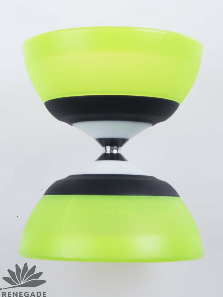 What really makes this diabolo unique is that is has a teflon inserted ring added to the cup. This is done so the point at which the string touches the inside of the cup it hits this teflon ring. This ring is very slippery, making adjusting the angle of the diabolo with the string is easier. This is important when doing 2-3 diabolos at the same time. In the photo of the green diabolo the teflon ring is the black ring on the cup. This diabolo also has an increased outer weight distribution. The outside edge of the cup is thicker pushing the centrifical force of the diabolo on the outside edge more. This is by far the most advanced diabolo made, and really makes a difference for advanced player.
