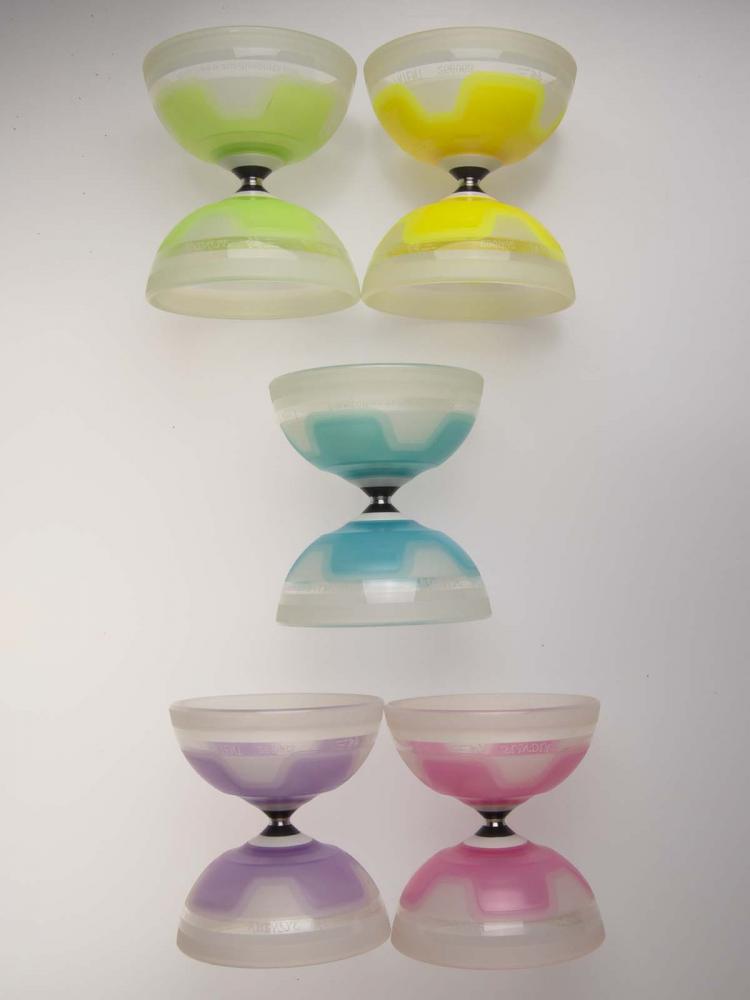 One advantage of the dual injection color is you can see how fast the diabolo is spinning. These translucent diabolos are wonderful for manipulations and can have one of three axle types: wide fixed, narrow fixed and triple bearing. Most will want the wide fixed for better stick grinds and axle play.