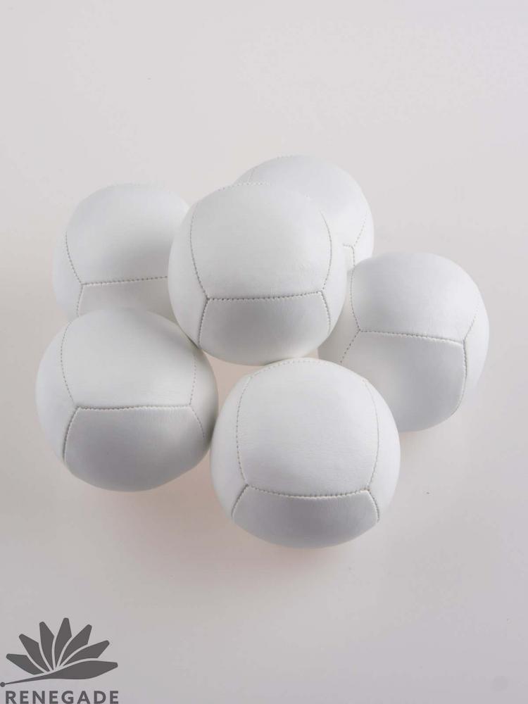 These white polyurethane (PU) bags are our best quality beanbag. They are made from Japanese Ultrafabric with a PU coating. Polyurethane-coated cloth is much more durable than vinyl coated cloth, and has a superior grip and feel. Ultrafabric is made for outdoor use and will not fade or peel like a vinyl (PVC) fabric. These balls have at least double the lifespan as those made with vinyl-coated cloth. The ball is constructed with an inner lycra bag, and then a six-panel outer PU shell. This construction using an inner bag makes for a stiffer feel and a longer lasting ball. The ball is sewn with high quality thread, filled with millet and sold in precisely matched weights.