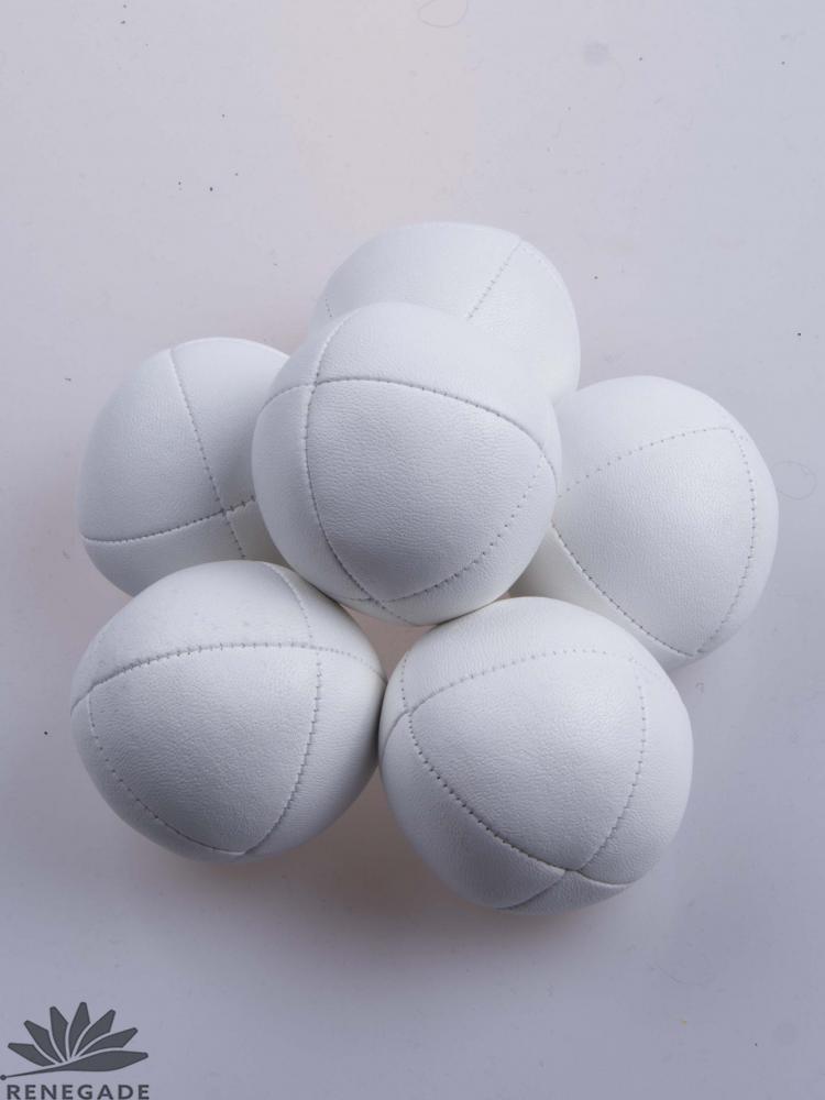 These white polyurethane (PU) bags are our best quality beanbag. They are made from Japanese Ultrafabric with a PU coating. Polyurethane-coated cloth is much more durable than vinyl coated cloth, and has a superior grip and feel. Ultrafabric is made for outdoor use and will not fade or peel like a vinyl (PVC) fabric. These balls have at least double the lifespan as those made with vinyl-coated cloth. The ball is constructed with an inner lycra bag, and then a six-panel outer PU shell. This construction using an inner bag makes for a stiffer feel and a longer lasting ball. The ball is sewn with high quality thread, filled with millet and sold in precisely matched weights.